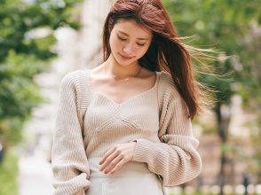 キャミソールとニットのセット¥18,700(リランドチュール)、パンツ¥4,389(ROPÉ PICNIC/ジュン)、バッグ¥66,300(カフネ)、靴¥12,100(ル タロン 有楽町マルイ店<ル タロン>)、イヤリング¥16,200(アビステ)、リング¥15,400(ズットホリック<エムシー・スタジオ>)