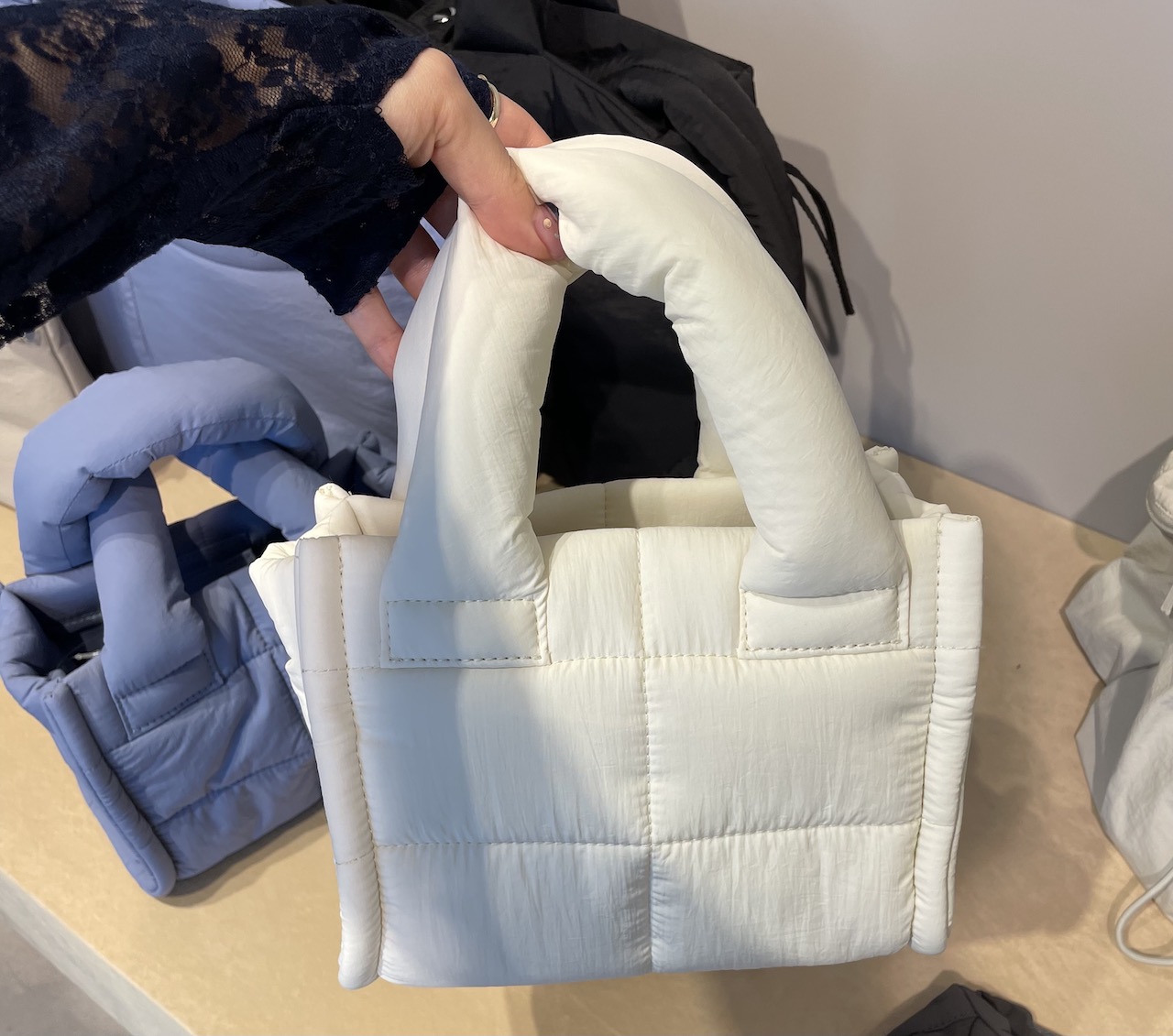 軽くてパフッとした感触がとっても心地いいミニバッグ。長さの調整と取り外しができるショルダーベルトが付いていて、シーンやコーデに合わせてアレンジできるのもうれしい。マチが広めで意外と荷物も入りそう!