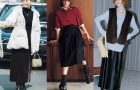 あえて首周りを隠したノースリニットが、あざとかわいいの秘訣。セクシーになりすぎないよう、ボトムはカーゴスカートでカジュアルに振りつつ、モノトーン&シルバー小物でシックにまとめるのが正解。