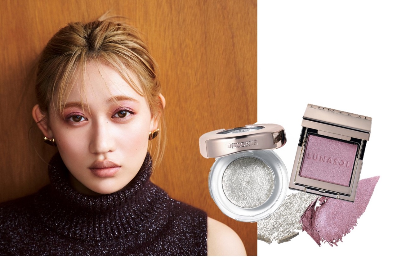 今シーズンはラベンダーカラーのアイシャドウが豊作。単色やグラデでそのまま使うのもありだけれど、よりエモいムードに仕上げるなら、輝度の高いラメをプラスオンして奥行きを出すのがおすすめ。シンプルなのにパッと目を惹く、おしゃれな華やかさも♡