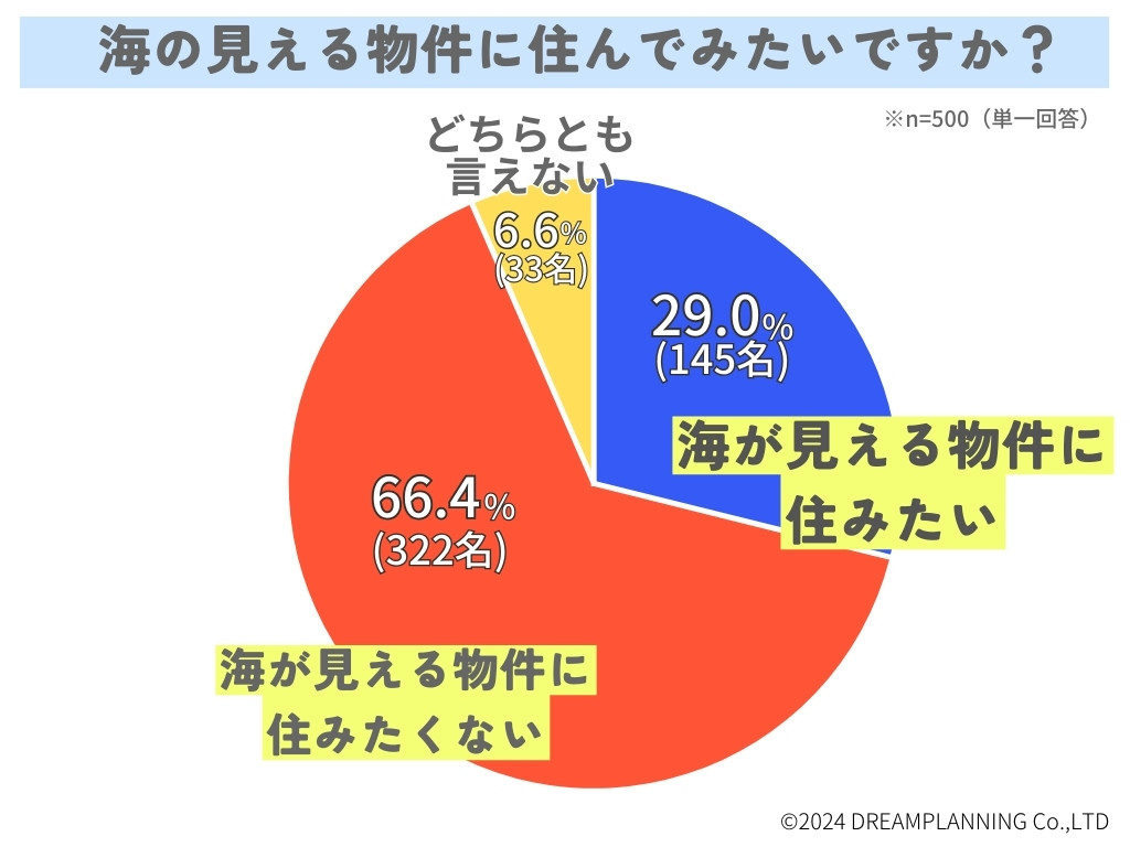 まず「海の見える物件に住んでみたいですか?」と質問してみると、3分の1近くが『住みたい』と答える一方で3分の2ほどが『住みたくない』と答える結果に。住みたい派と住みたくない派、それぞれの回答理由も気になるところ。