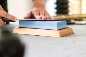 • Chef,Sharpening,Knife,On,Table.,Japanese,Setting,With,Asian,Woman.