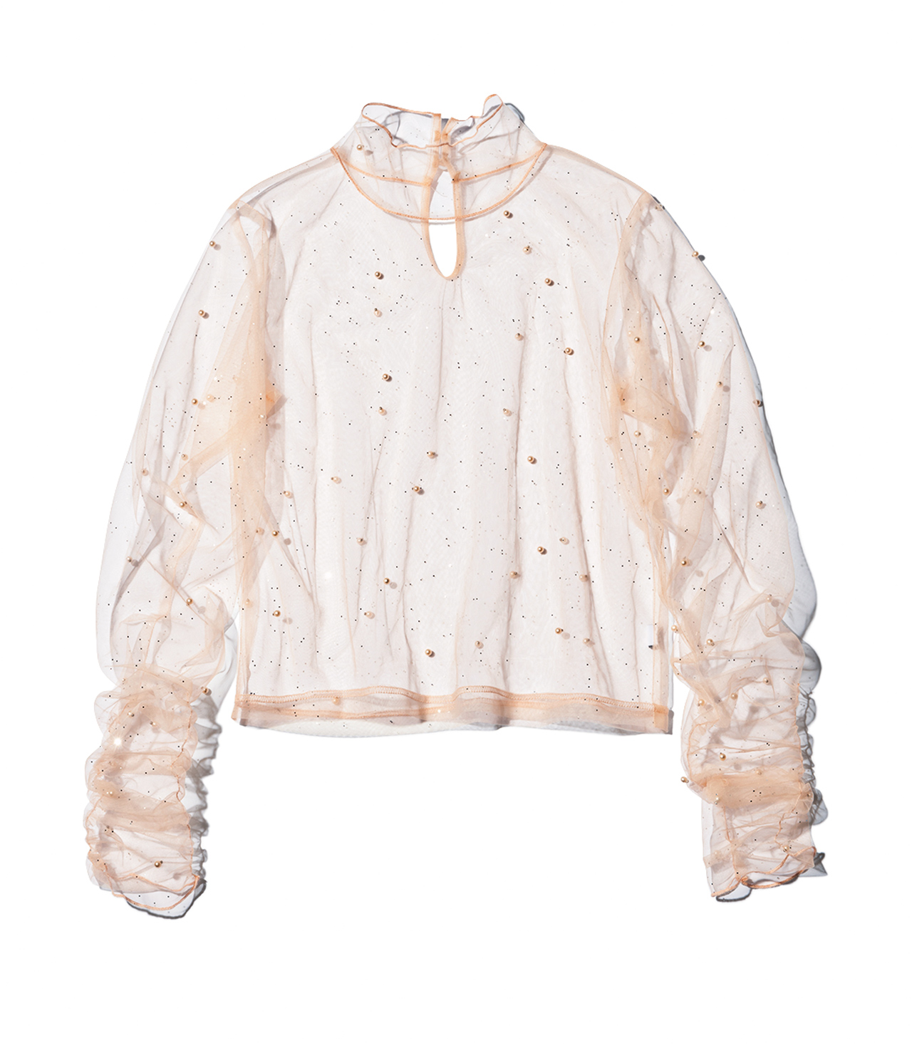 ドットのようなパールが上品かわいい。秋本番はカリッとしたジャケットの下に着て、甘辛を楽しむのもgood!