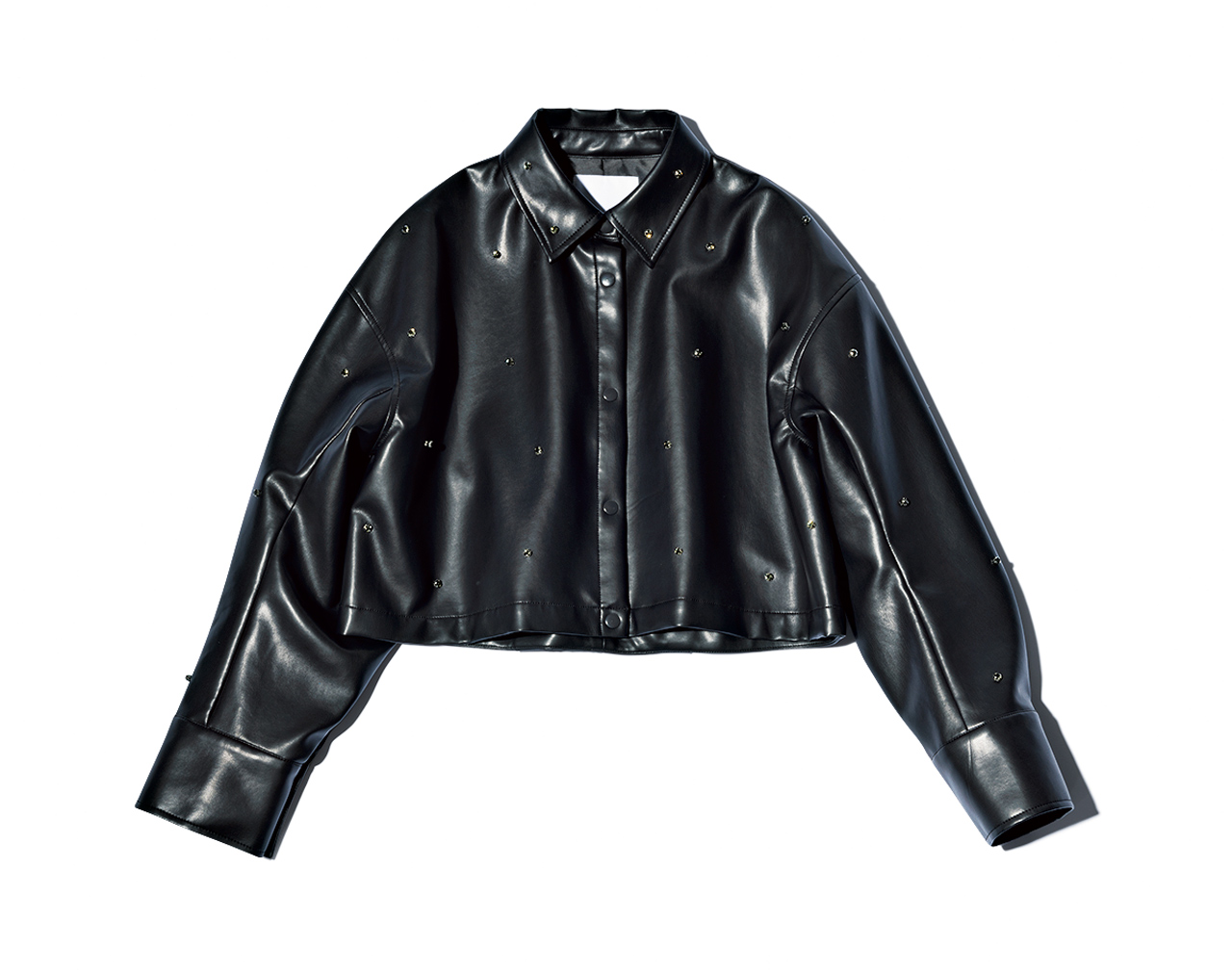 レザーアウターにも、きらめきビジューが! ビジューで、レザーの辛口さを軽減。