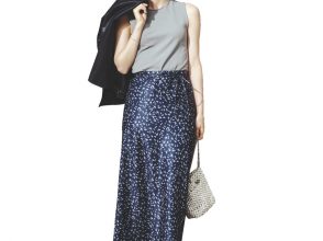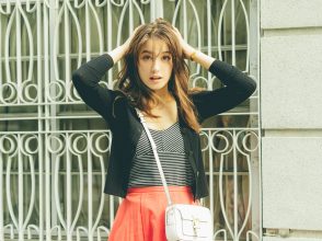 スカート¥9,980(トリート ユアセルフ)、ニット¥52,800(フィルム<CORCOVADO>)、バッグ¥4,389(VIS/ジュン)、靴¥15,900(CHARLES & KEITH)、カチューシャ¥20,900(アレクサンドル ドゥ パリ GINZA SIX店<アレクサンドル ドゥ パリ>)、ピアス¥10,340(チビジュエルズ・ジャパン<チビ・ジュエルズ>)