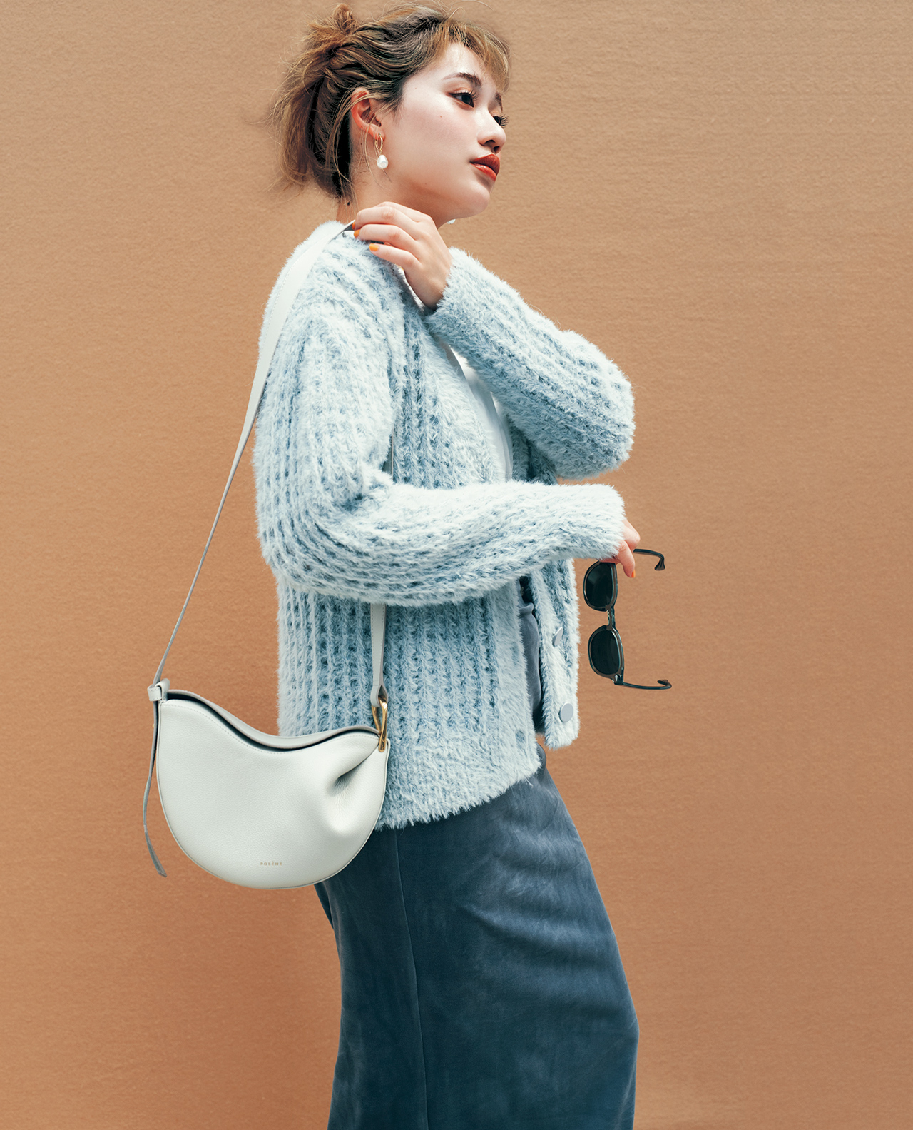 バッグ[17×24×7]¥75,000(ポレーヌ)、カーディガン¥16,940(LILY BROWN ルミネエスト新宿店<リリー ブラウン>)、Tシャツ¥9,680(ザ ショップ スローン 新静岡セノバ店<スローン>)、スカート¥8,250(リゼクシー)、手に持ったサングラス¥50,600(モスコット トウキョウ<モスコット>)、ピアス¥3,520(AKTE)