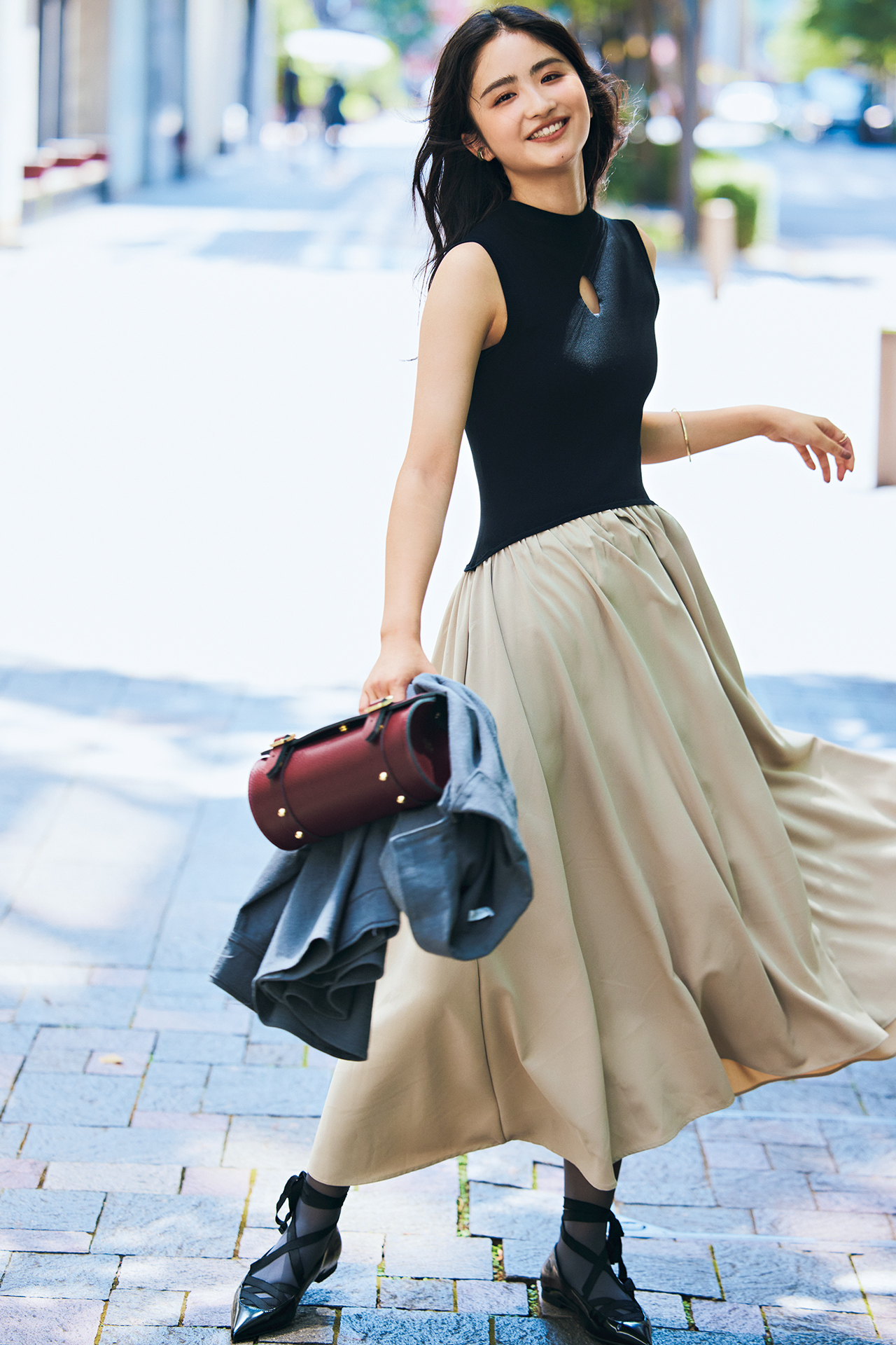 ワンピース¥21,050・手に持ったジャケット¥16,770(VALLAN)、バッグ¥39,600(エスピービー<ケンブリッジ サッチェル>)、靴¥9,500(CHARLES & KEITH)、タイツ¥1,210(タビオ<靴下屋>)、イヤカフ¥1,980(ゴールディ)、バングル¥24,800・リング¥21,300(BORRAKE)