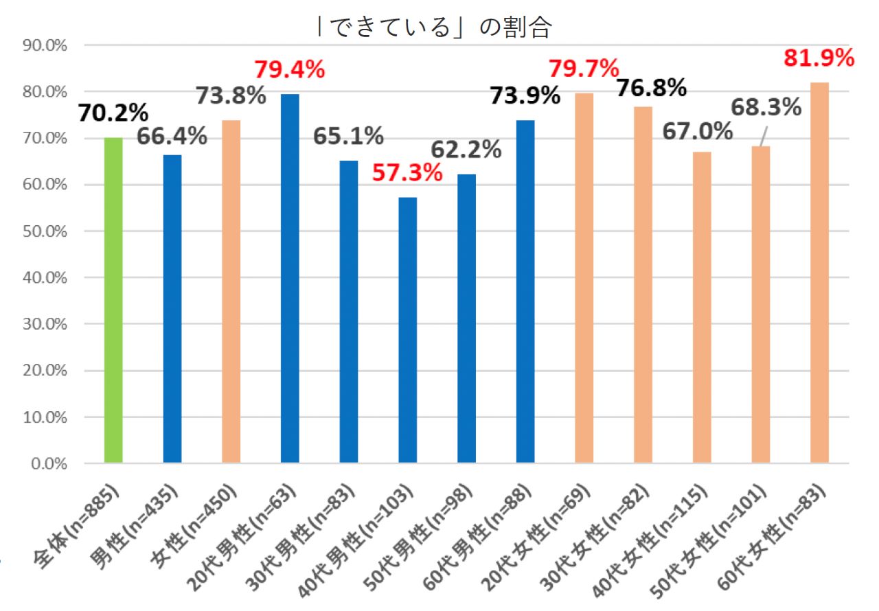 全体では「できている」が70.2%という結果に! ちなみに年齢、性別ごとに見てみると、男性は20代が最も高く、次いで60代という結果に。女性は60代が最も高く、次いで20代でした。