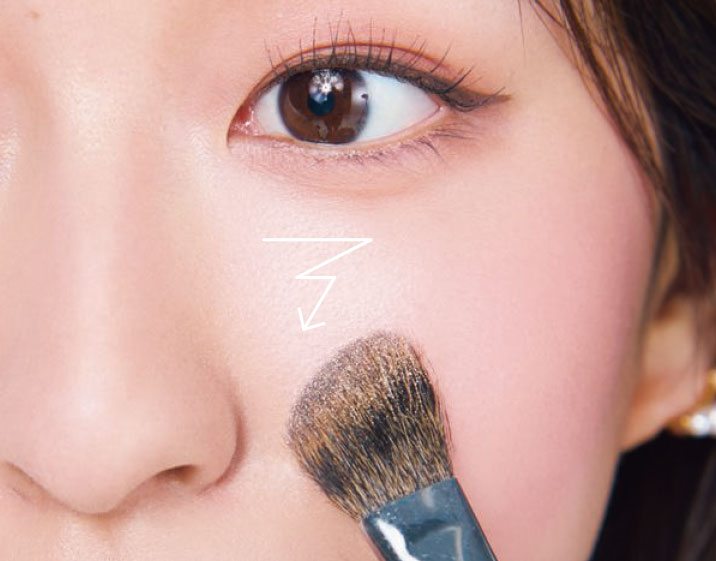 右のハイライトをブラシに取り、頬骨の高い位置から目尻横、鼻とあごの先端に塗る。チークと混ぜるようになじませながら入れるのがポイント。