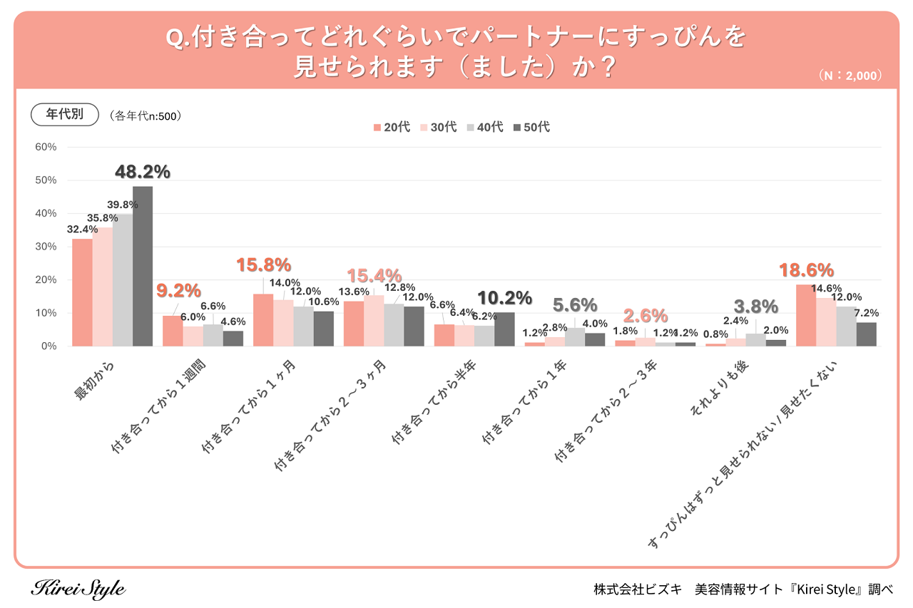 美容や健康にまつわる情報を発信する「Kirei Style(キレイスタイル)」の運用を行う株式会社ビズキは、全国の20~50代の女性2,000人を対象に美容に関するアンケートを実施。その結果をもとに、「付き合ってからパートナーにすっぴんを見せられるまでの期間」について探っていきます。
