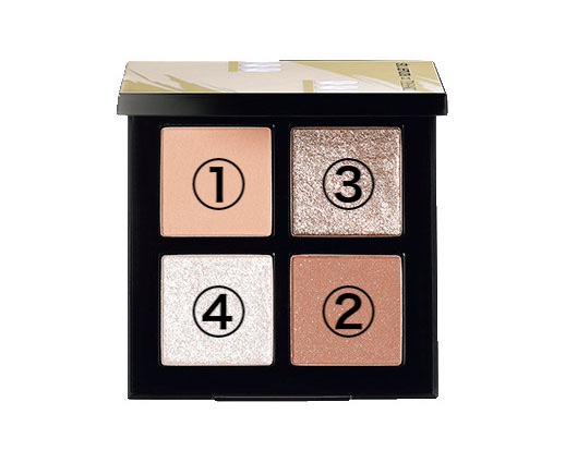 アイシャドウの①のベージュを上下のまぶた全体にのせる。②のブラウンを上の目のキワに重ねる。③のゴールドを下の目頭部分に、④のシルバーを上の目頭のくぼみにのせる。