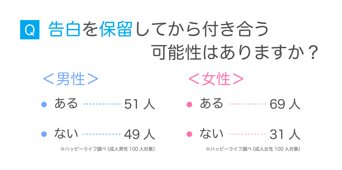 「告白を保留されたことはありますか?」という質問では、女性では29人、男性ではなんと44人が「ある」と回答しています。返事待ちということになると「まだ告白するには早かったか…」とつい一瞬思ってしまいそうですが、実際に「保留」された場合、その後いい返事をもらえる可能性はあるんでしょうか?