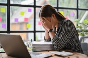 • A,Stressed,And,Frustrated,Millennial,Asian,Businesswoman,Is,Covering,Her