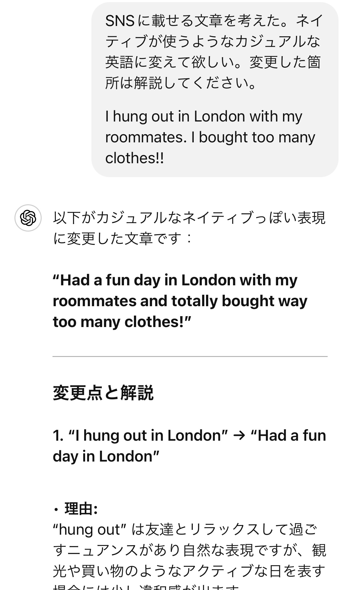 するとこの通り、SNSに適したカジュアルな表現を教えてくれました! 載せきれませんでしたが、「テンポよくする方が読みやすくなるので、2つの文を1つにまとめた」とのこと。ChatGPT、わかってる…!