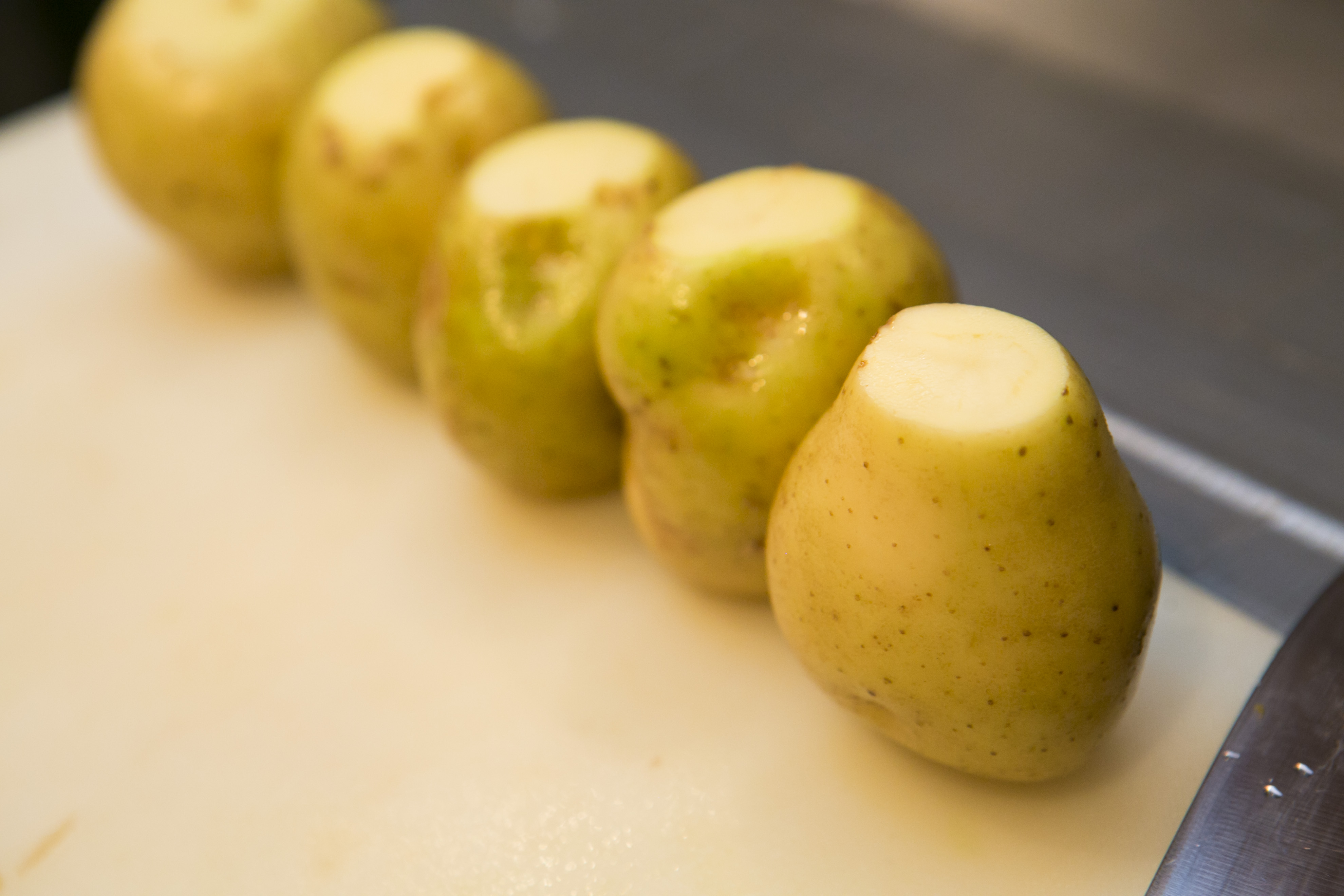 男爵いもの皮をキレイにむくための方法を伝授するぞ。下の写真のようにいもの天地を包丁で落とすことでピューラーが当てやすくなるんだ!