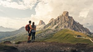 • Couple,Of,Backpackers,Embraced,Contemplating,The,Majestic,Mountains,In,Front