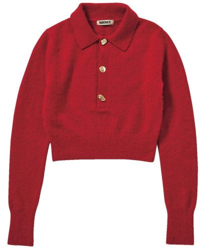 3つとも違うデザインの金ボタンがすごくかわいくてひと目ボレ! いつもは選ばない赤色だけど、ポロニットとのレトロな組み合わせがツボで久しぶりにトライしました。