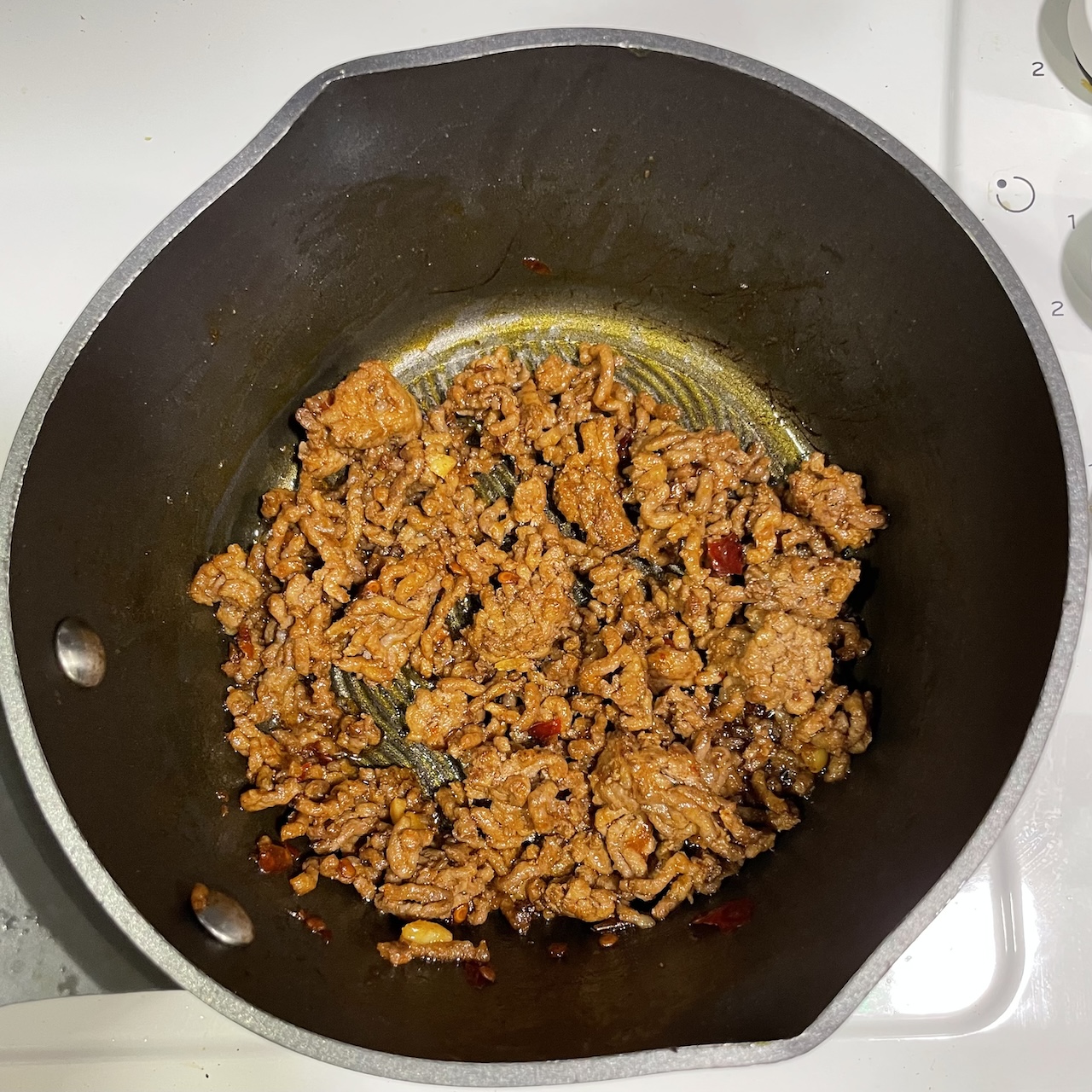 ②ひき肉を入れて炒め、色が変わったら豆板醤とはちみつを入れる