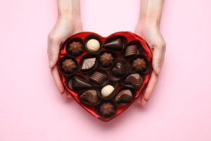 • Woman,Holding,Heart,Shaped,Box,With,Delicious,Chocolate,Candies,On