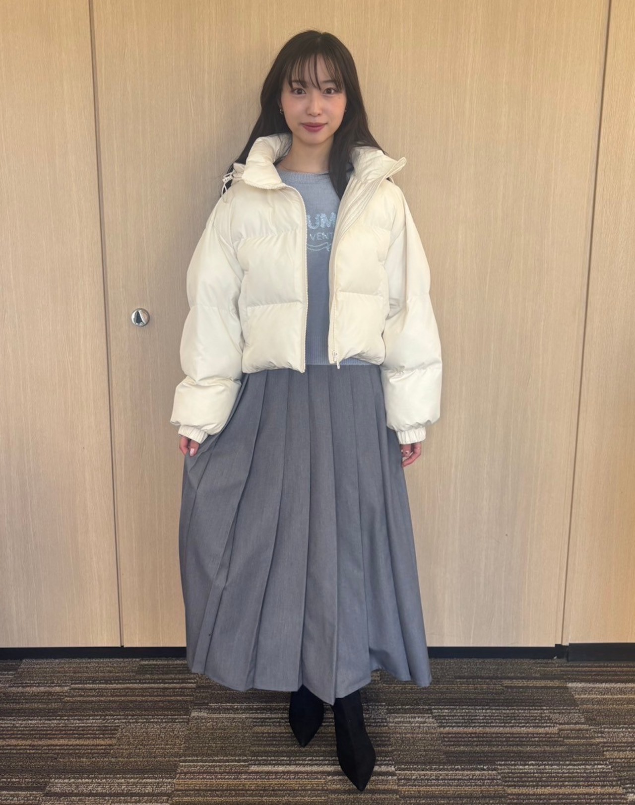 寒さが厳しい本日は、白のダウンコートであったかく&上品に。アイスブルーニット×グレースカートのアイシー配色のコーデに羽織ると、洗練された印象が叶います。通勤シーンにも◎。