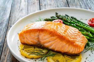 • Fried,Salmon,Steak,With,Cooked,Green,Asparagus,,Cherry,Tomatoes,And