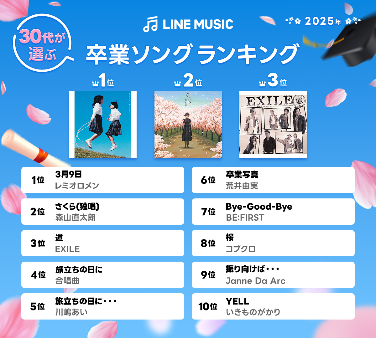 今回は、音楽ストリーミングサービス「LINE MUSIC」が全国の10代、20代、30代、40代以上の各世代の男女に聞いた「卒業ソング」のアンケート結果をランキング形式でご紹介。時代を超えて愛される名曲から今どきの人気曲まで、思い出を振り返りながら見ていきましょ!
