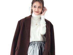 パンツ¥14,300(リーバイ・ストラウス ジャパン<リーバイス®>)、ブラウス[インナー付き]¥18,920(SNIDEL ルミネ新宿2店<SNIDEL>)、手に持ったコート¥26,400(カデュネ)、バッグ¥19,800(セムインターナショナル<The Bagmati>)、靴¥60,000(バナナ・リパブリック)、カチューシャ¥8,030(THE HAIR BAR TOKYO<THE HAIR BAR TOKYO>)、ピアス¥13,750(ココシュニック<ココシュニック オンキッチュ>)、リング¥11,770(ズットホリック<ソコ>)