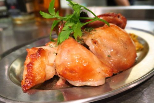 数種類のスパイスをブレンドした自家製マリネ液に半日以上漬け込んで、専用のロースターオーブンで1時間もかけてじっくり焼き上げています。皮はパリッと、中はジューシーでおいしい~!