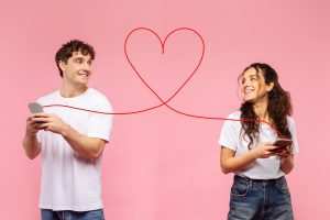 • Happy,European,Man,And,Woman,Chatting,In,Dating,Application,,Using