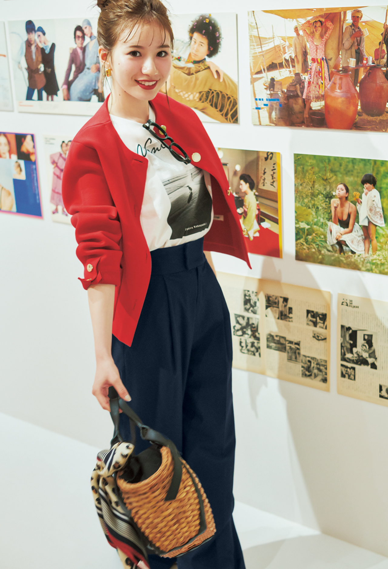 【Mizuho】赤が間違いなくおしゃれに決まる、トリコロール配色。インナーのフォトTが、頑張りすぎないこなれ感を演出してくれる。大きめの金ボタンも、パリっぽムードにひと役!