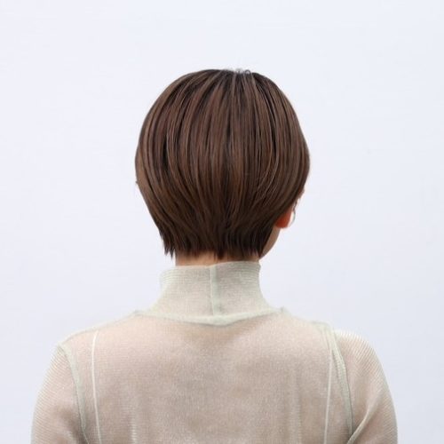 「すっきりとしたコンパクトショートは、表情が明るく見えて清潔感も◎。フェミニンとカジュアルのバランスがいいので、どんなファッションにも合わせやすいと思います。スタイリングがラクなのもポイント。マッシュベースにカットして、表面にだけ角を落とす程度のレイヤーを入れています。前髪は薄めに取って抜け感のあるシースルーに」(担当:新地さん)