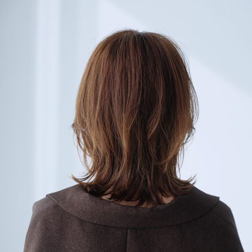 「空気を含んだレイヤーヘアと透明感のあるカラーで、好感度の高い甘めコンサバに。ラウンドバングで薄めの前髪をつくり、サイドのレイヤーをリバースカールにすることで、顔まわりを華やかに印象づけています。襟足はハネるように切りサイドからレイヤーを入れて毛流れをつくり、自然と肩にあたる長さにカット。サイドの流れるレイヤーから後頭部にかけて繋がりのある丸みをつけ、少しくびれのある髪型に仕上げています。小顔に見えるレイヤーを入れておくと、ヘアをアップにしたときも後れ毛のようなアレンジができて◎」(担当:冬木さん)
