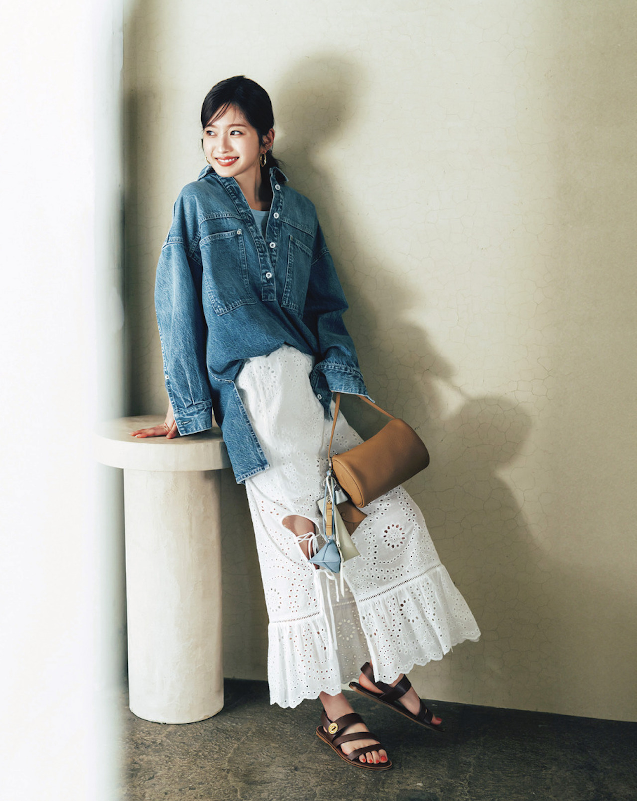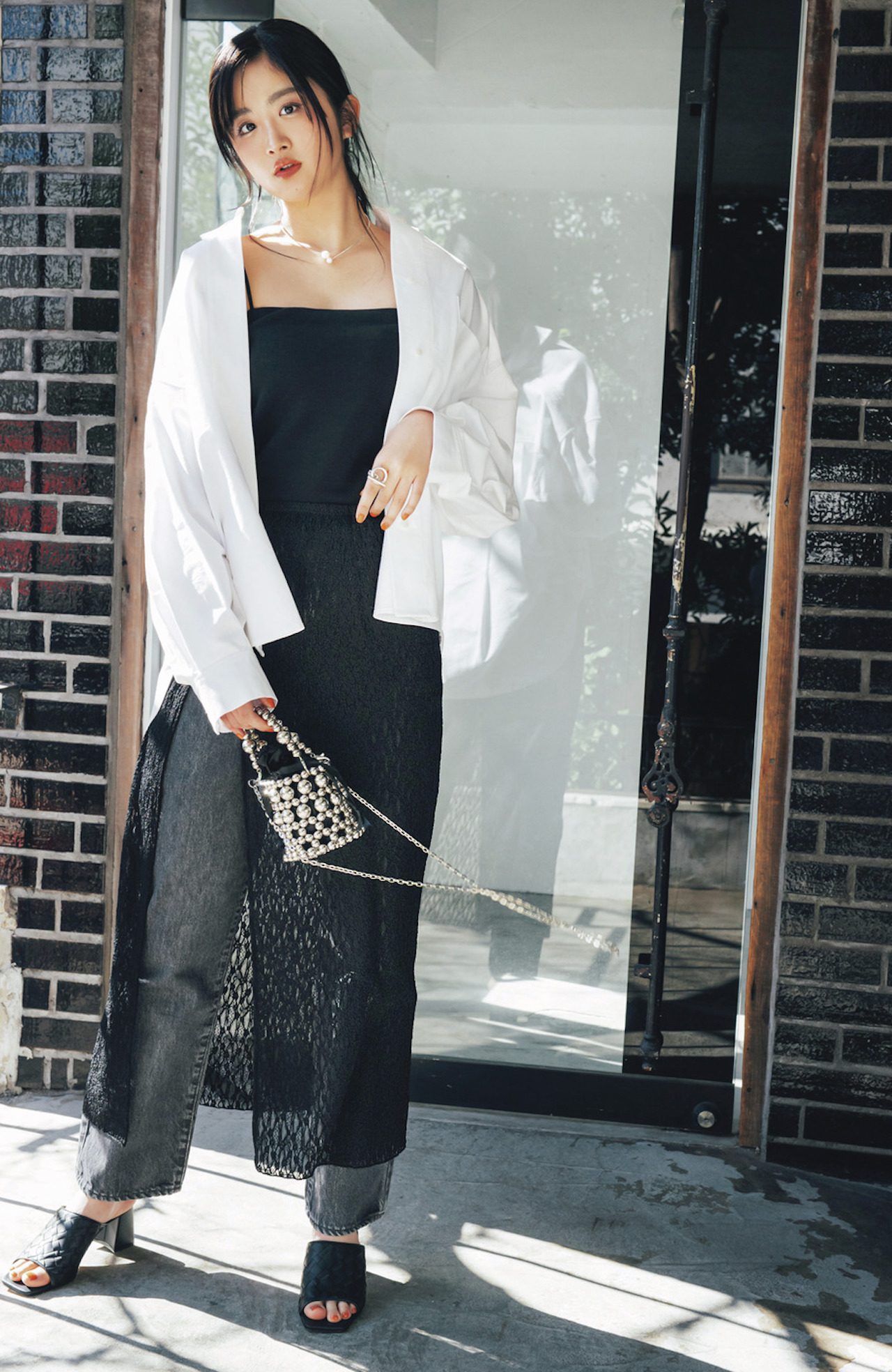 深いスリット入りでレイヤードがしやすいレーススカートは、今季ならではのアイテム! シャツ×キャミの肌感が醸す大人っぽい抜けとデニムのラフさで、レーススカートコーデをアップデート♡