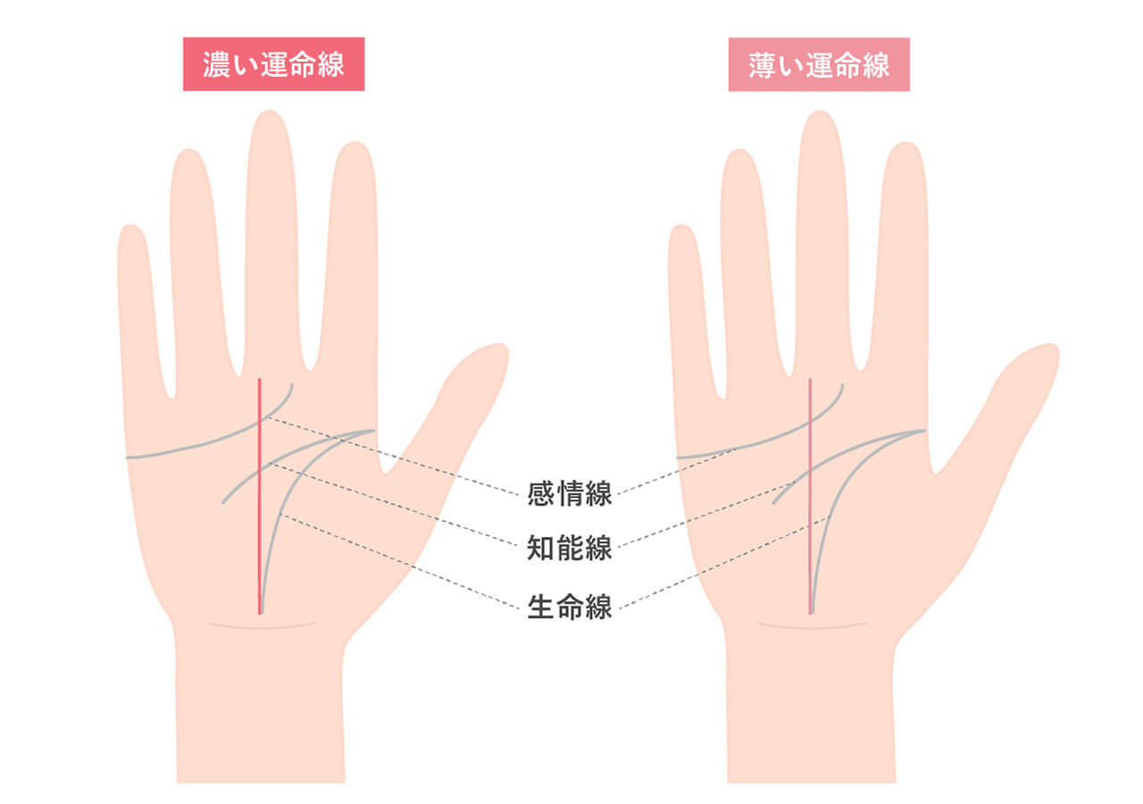 運命線が濃いほど、その人が生きることへの情熱を持ち、高いモチベーションで充実した時期を過ごしていることが考えられます。一方で薄い運命線の場合は、努力や使命感がやや低下傾向にあり、運気にも停滞が見られる可能性があります。
