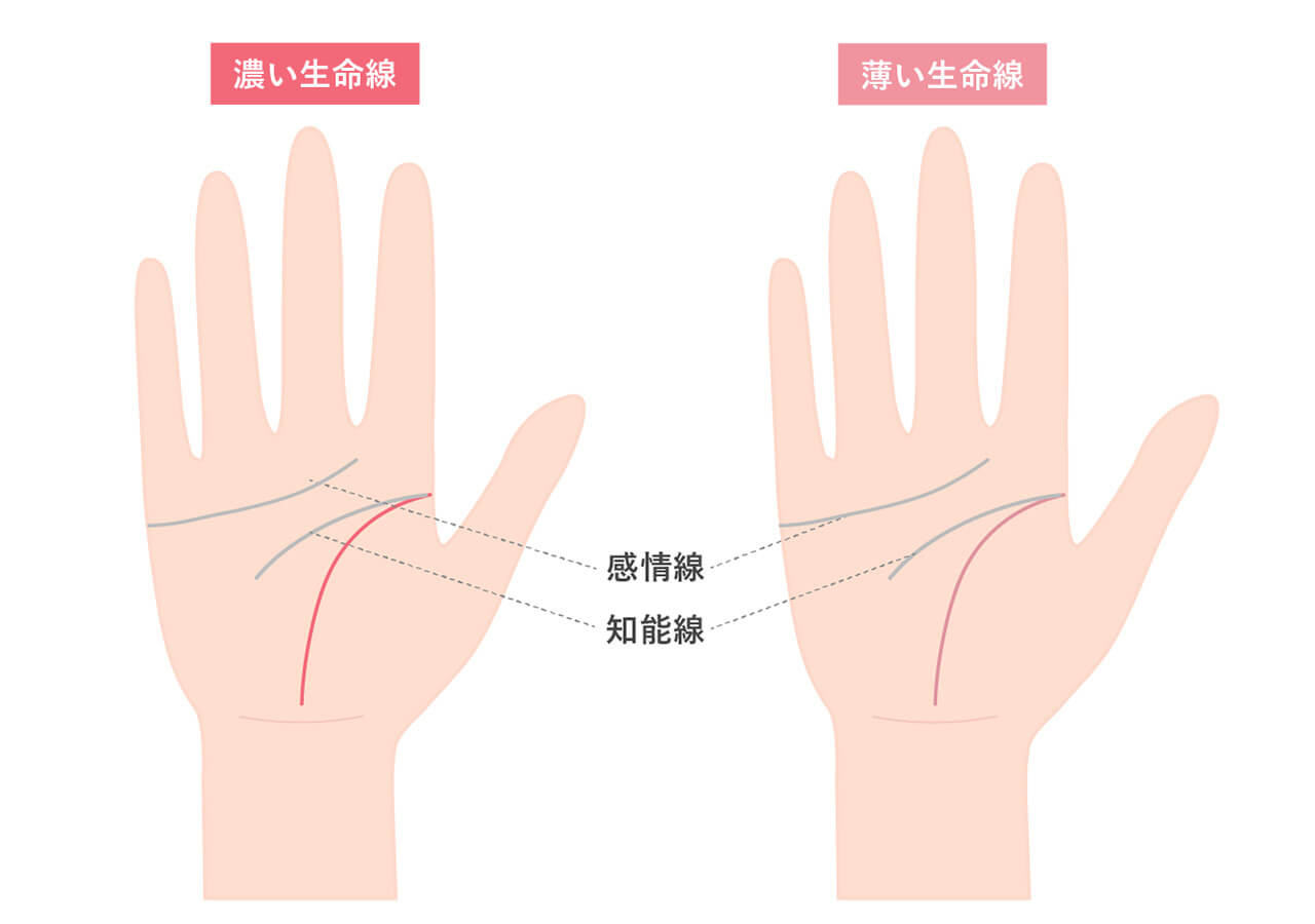 反対に、生命線が知能線や感情線に比べて薄く弱々しい場合は、スタミナ不足の可能性があります。その場合は、自分のやりたいことを絞り込み、一つの目標に集中することで驚くような成果を得られるかもしれません。
