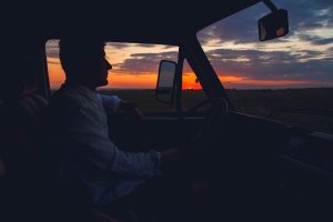 • Silhouette,Of,Man,Driving,A,Car,On,Sunset,Background.,Travel