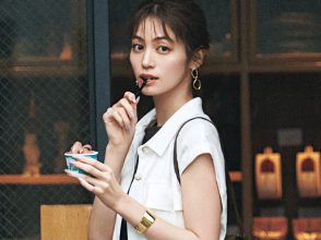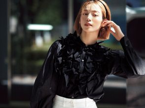 シャツ¥19,800(ゲストリスト<ヘルシーデニム>)、カットソー¥8,250(ヒロタ<Noëla>)、パンツ¥31,900(カイタックインターナショナル<ヤヌーク>)、バッグ¥42,900(ジャンニ キアリーニ 銀座店<ジャンニ キアリーニ>)、靴¥17,600(ダイアナ 銀座本店<クムウ_ダイアナ>)、サングラス¥52,800(モスコット トウキョウ<スコット>)、チョーカー¥3,630(アネモネ/サンポークリエイト)