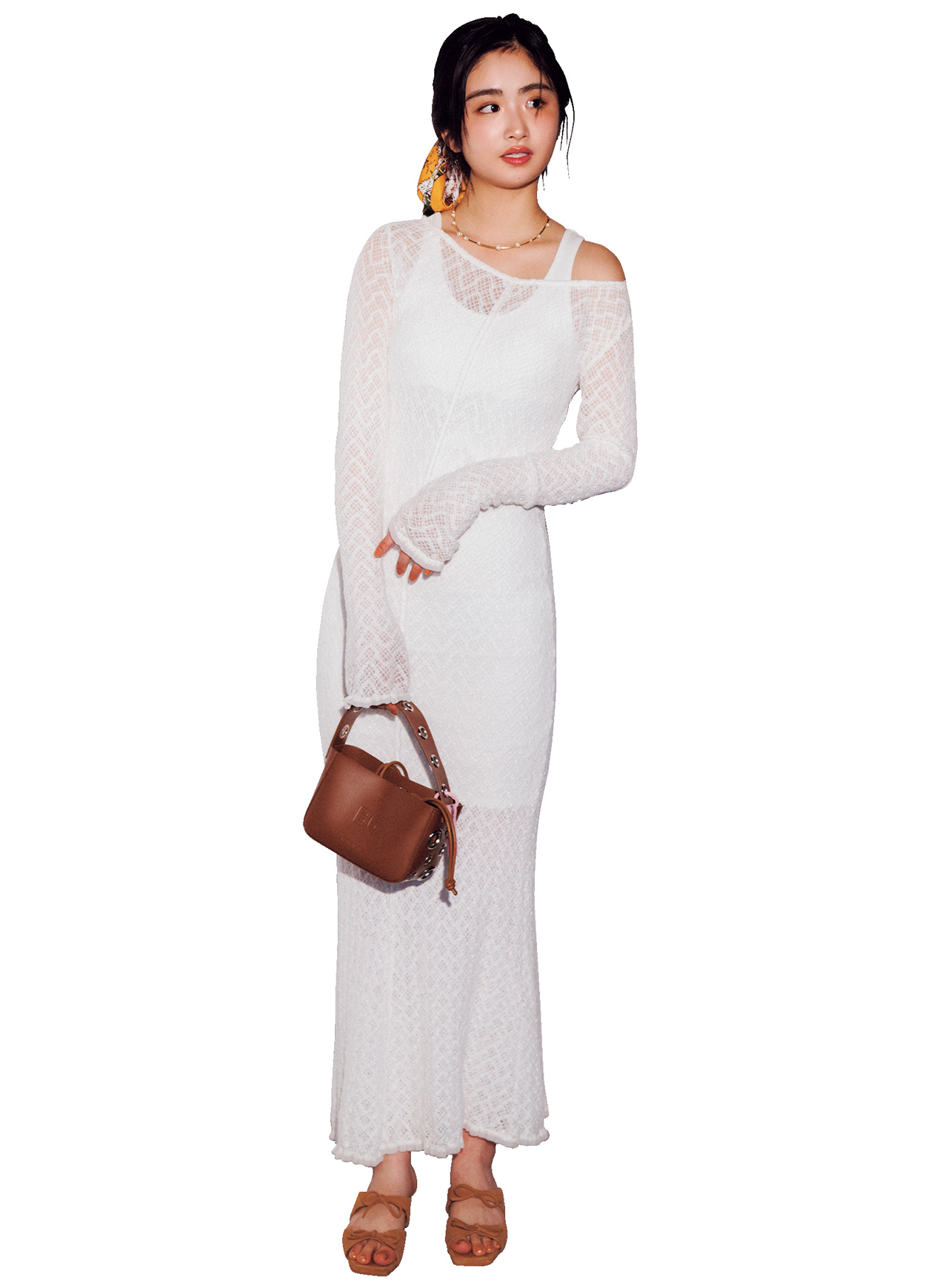 かわいいイメージの白のカットレースも、体に沿うカーヴィーシルエット&ワンショルだとグッと美人に仕上がる! インナーのミニタンクワンピは、カップ付きで便利。ブラウンの小物やスカーフで、白コーデにキレを上乗せ。