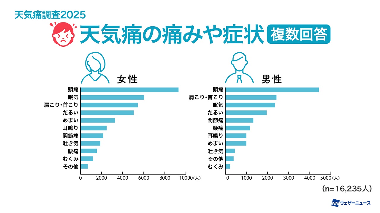 「女性は男性よりもどの世代においても痛みの程度が大きいことがわかりました。女性はホルモンの変化で体調が変わりやすいので、天気の影響を受けると症状が強くなりやすいのです。