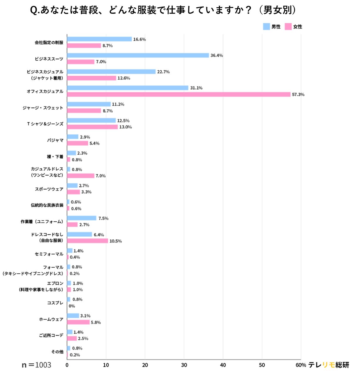 男性は「ビジネススーツ(36.4%)」や「ビジネスカジュアル/ジャケット着用(22.7%)」など、対面を意識した服装を選んでいます。