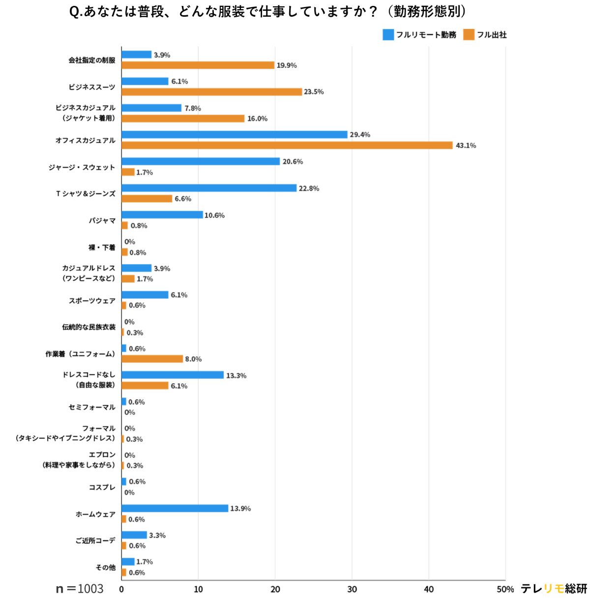 フルリモートとフル出社、いずれも1位は「オフィスカジュアル」でしたが、2位以下には大きな差が生まれる結果に。