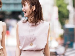 ブラウス¥46,200(マルティニーク ルミネ横浜<MARGE>)、中に着たタンクトップ¥3,990(オンワード樫山<UNFILO>)、パンツ¥29,700(カイタックインターナショナル<ヤヌーク>)、机に置いたバッグ¥30,400(ルメン<ルメン>)、バッグに付けたサングラス¥47,300(アイヴァン 東京ギャラリー<アイヴァン>)、チョーカー¥16,500・リング[人さし指]¥17,600(アルティーダ ウード)・[中指]¥5,500(フィービィー)、バングル¥14,580(アビステ)