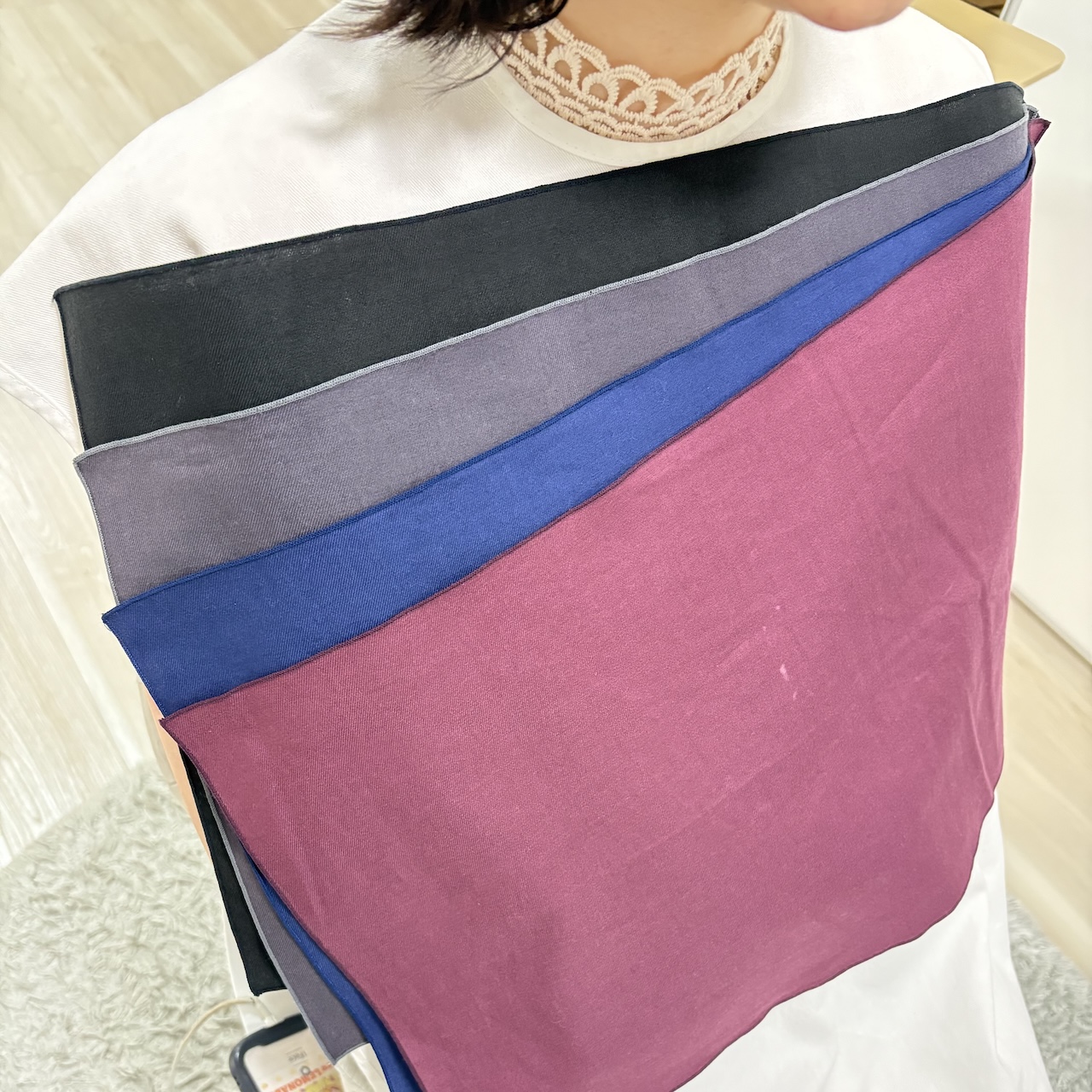 コンサルタントさんと一緒に一枚一枚確認していくと、最初は「あ! これはキレイに見える」「これは顔がくすむな」など色々考えながら受けていたのですが、ドレープを見すぎてだんだんとわからなくなってしまいました(笑)