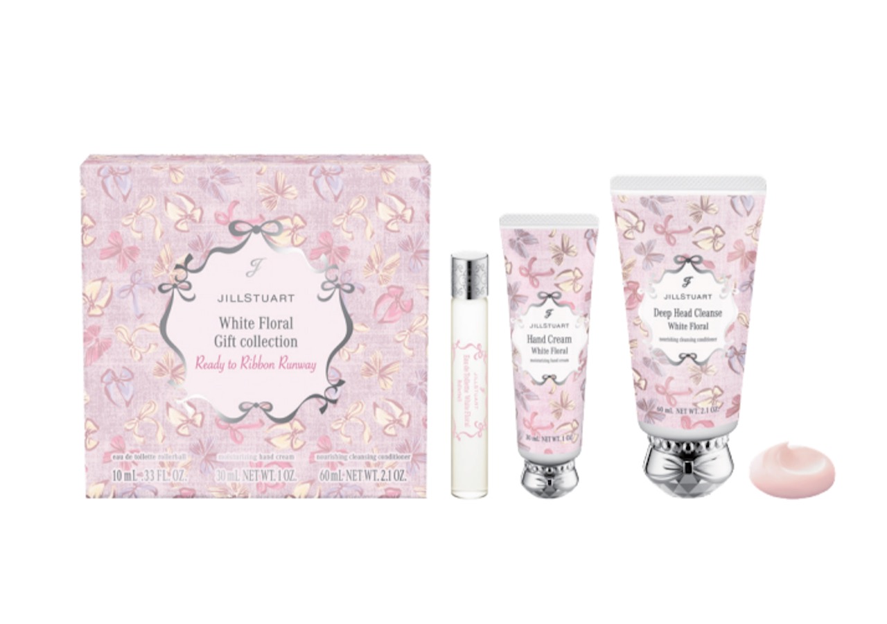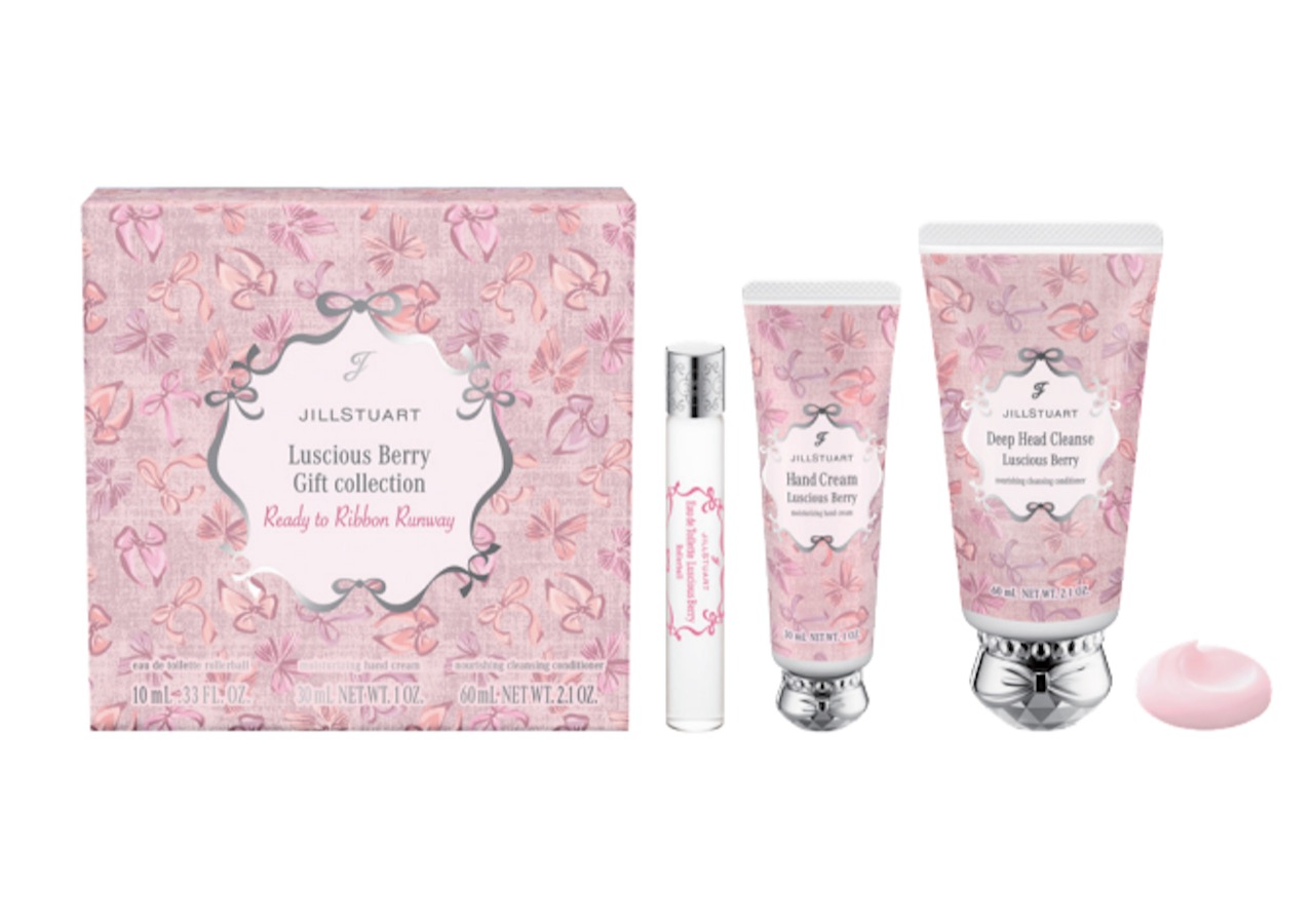 オードトワレ、ハンドクリーム、ディープヘッドクレンズ の3アイテムがかわいらしいリボン柄ボックスに収まった「ギフトコレクション レディートゥリボンランウェイ」。香りは、純白のブーケをイメージした「ホワイトフローラル」、心和むミルクティーにラベンダーが溶け込んだ「ミルクティーブレンド」、フレッシュなベリーと鮮やかな花々が重なる「ラシャスベリー」の3種類が登場します。