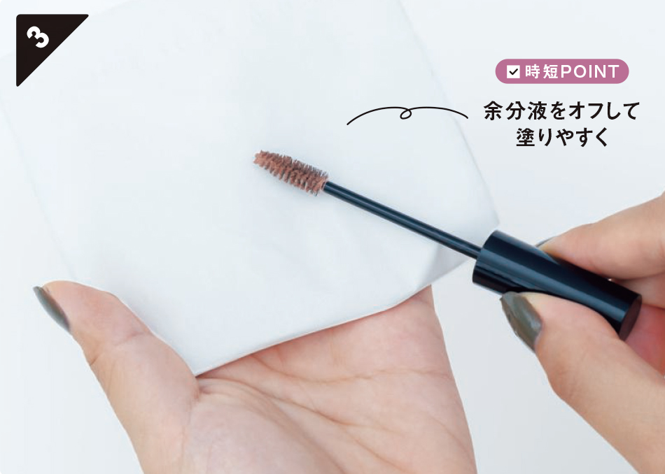 アイブロウマスカラのブラシをティッシュで包み、余分な液を落とす。根元からしっかり塗っても眉に液がつきすぎず、自然に仕上がる!