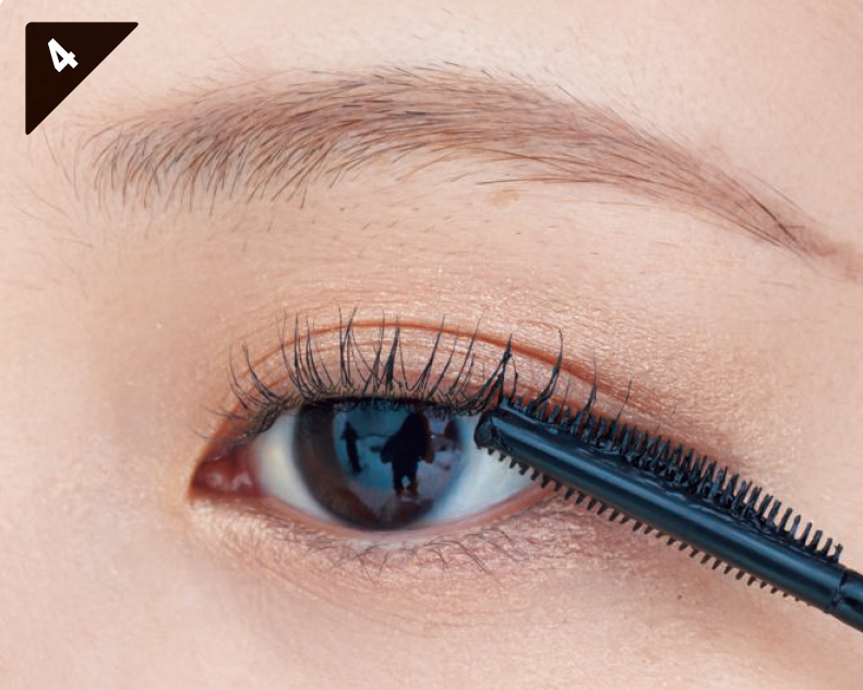 マスカラを上下まつげの根元からたっぷり塗る。繊維が入っているとダマになりやすいので、繊維ナシのなめらかな液が時短に最適!