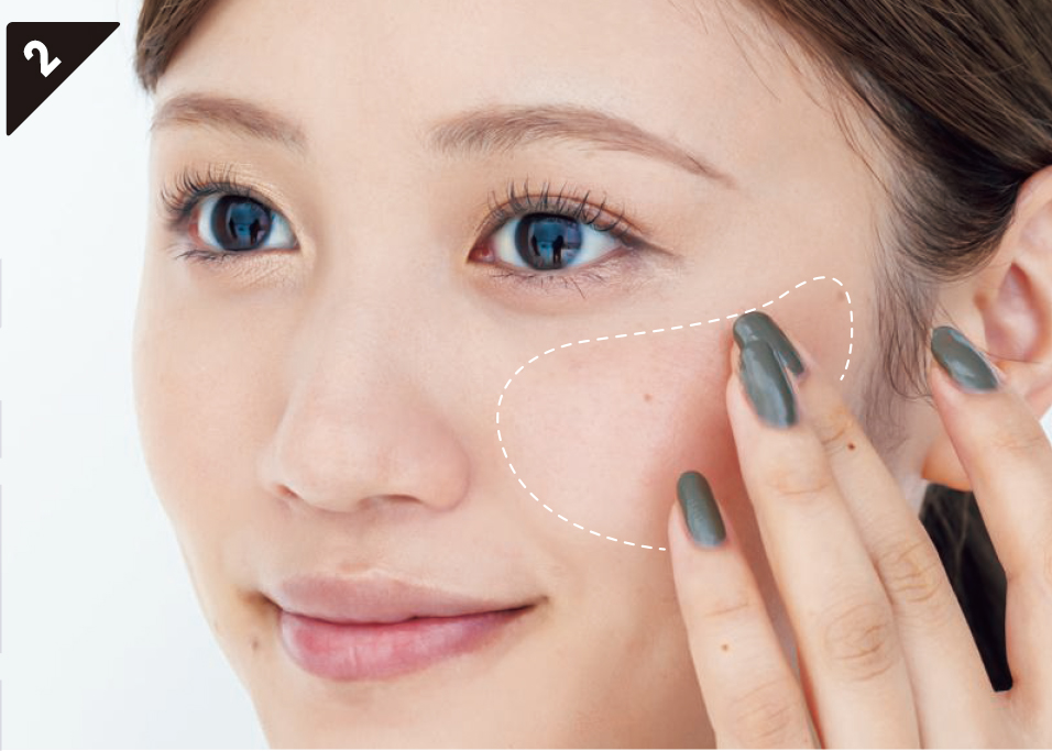 マルチカラーを指に取り、頬の中心から外側に3点置き。BBクリーム同様、細かく点置きするとムラなくなじませやすい!