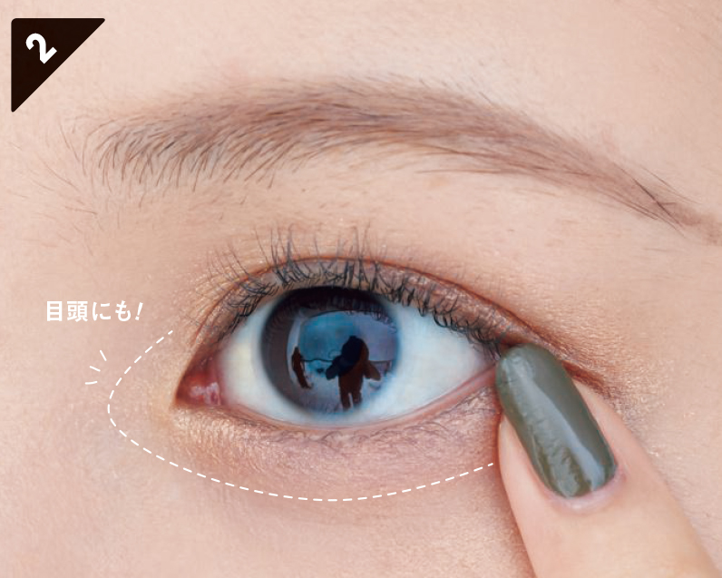 ラメシャドウを指に取り、上まぶた全体に塗る。陰影とラメ質感を際立たせるために、眉下まで大胆に広げて。
