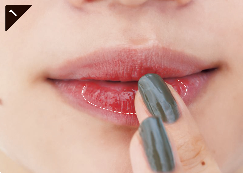 マルチカラーを指に取り、上下唇の内側にポンポンと塗る。赤は唇全体に塗ると濃い印象になるので、グラデーションを意識。