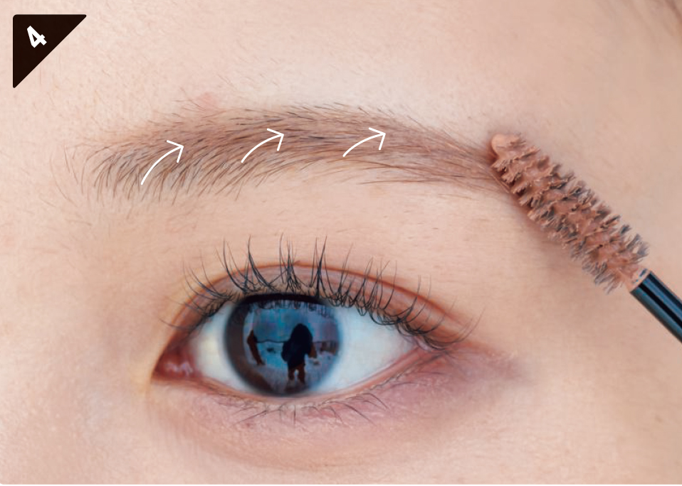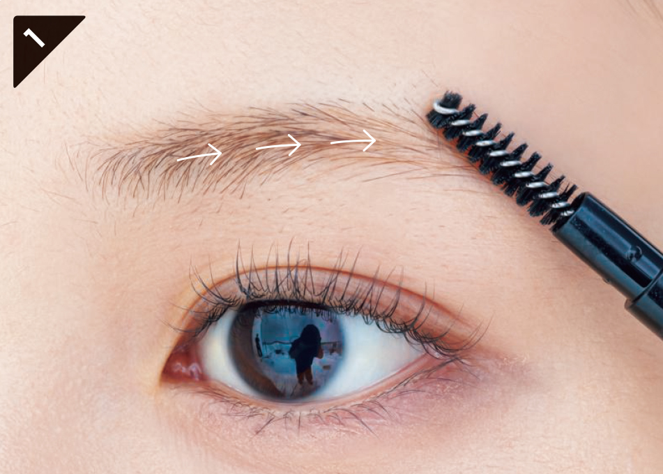 アイブロウペンシルにセットされたスクリューブラシでササッと毛流れを整える。このひと手間で毛が足りないところが見え、描き足す部分が明確に!